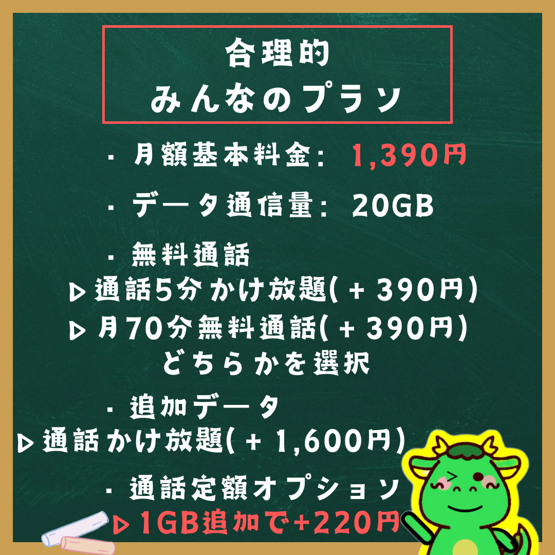 月額1,390円で20GBの大容量と5分かけ放題や70分無料通話がついてきます。データ追加料金も安いため、月の使用量が20GBを超えても安心して利用できます。