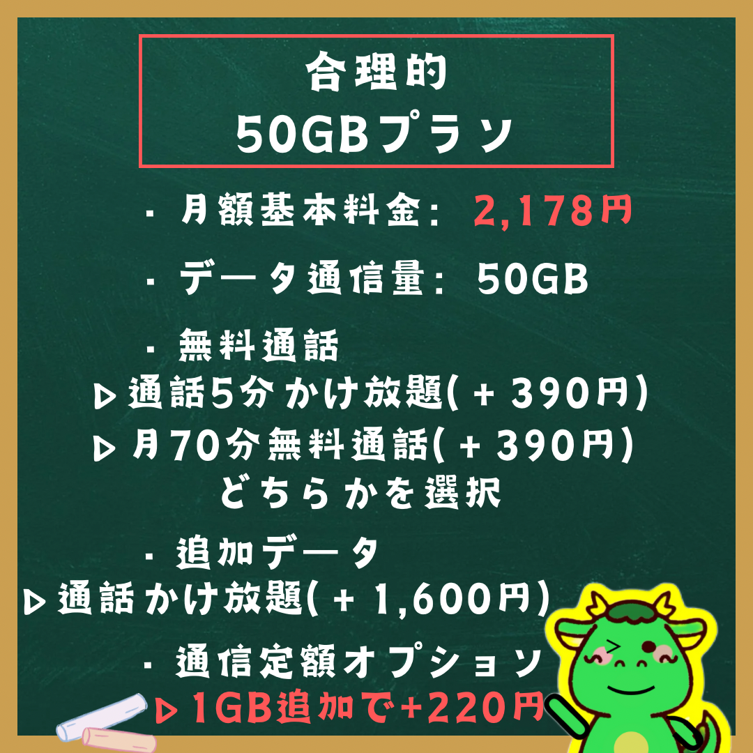 月額2,178円で50GBという非常に大きいデータ容量と、5分かけ放題や70分無料通話が使え、大容量を必要とするユーザーには高いコストパフォーマンスを実現できます。